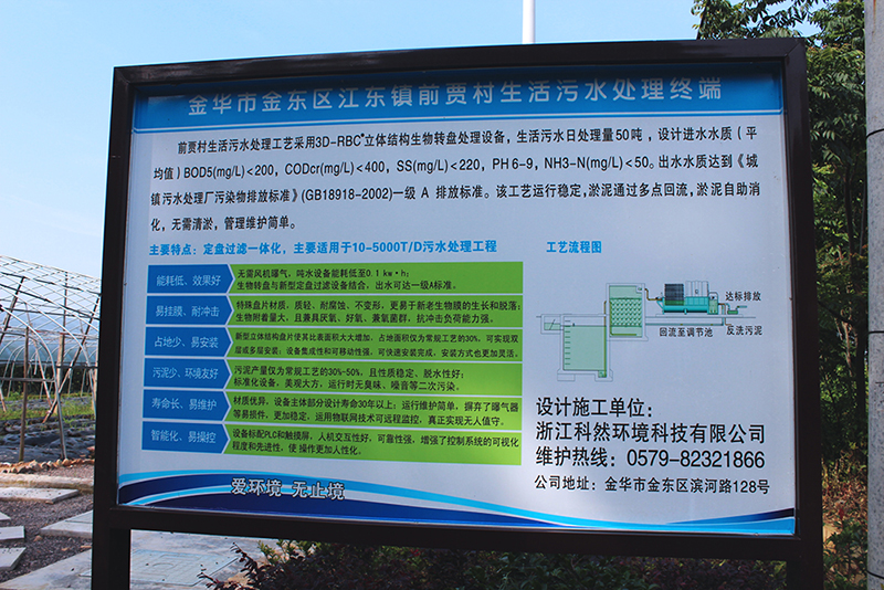 金華市江東鎮(zhèn)前賈村生活污水處理工藝采用3D-RBC立體結(jié)構(gòu)生物轉(zhuǎn)盤處理設(shè)備,生活污水日處理量50噸,